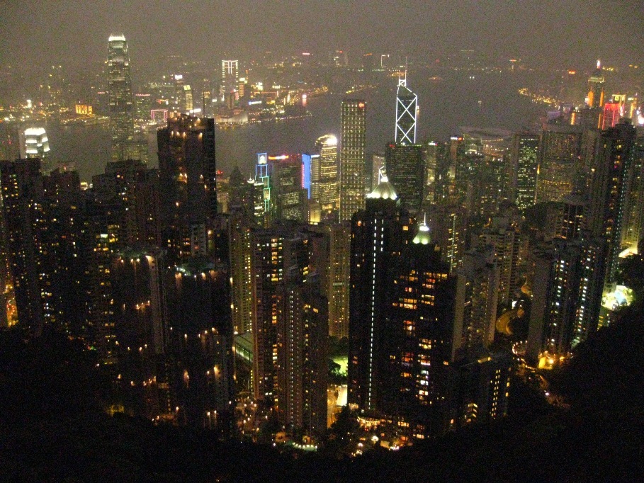 Le centre-ville, la nuit, vu du Victoria Peak. Au-loin, Kowloon