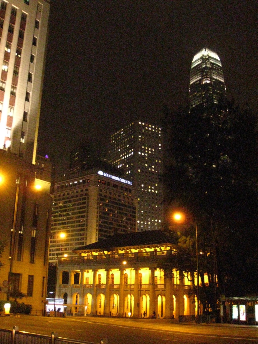 Au premier plan, l'édifice du Conseil législatif, la nuit