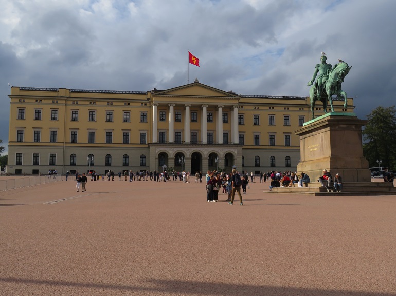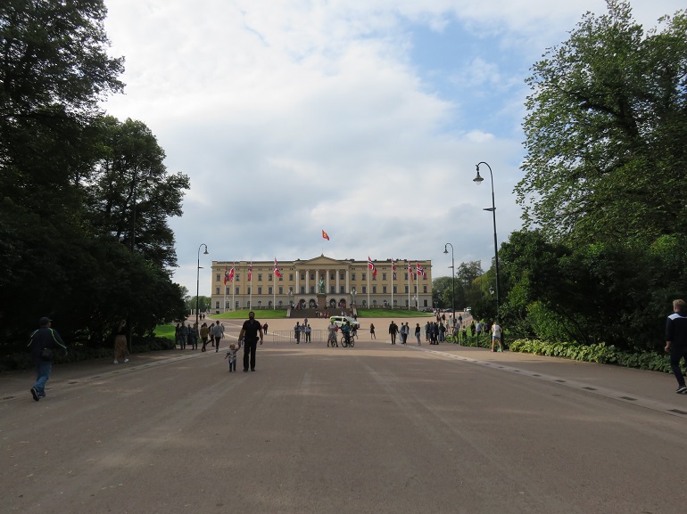Karl Johans gate, principale artère piétonne de la ville. Tout au bout, le palais royal.