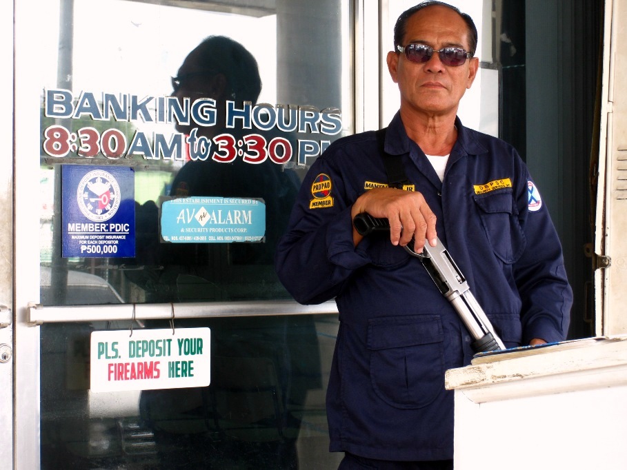 Gardien de sécurité à l'entrée d'une banque de Puerto Princesa, sur l'île de Palawan